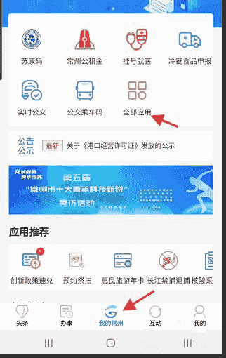 点击下方中间,找到我的常州进入;