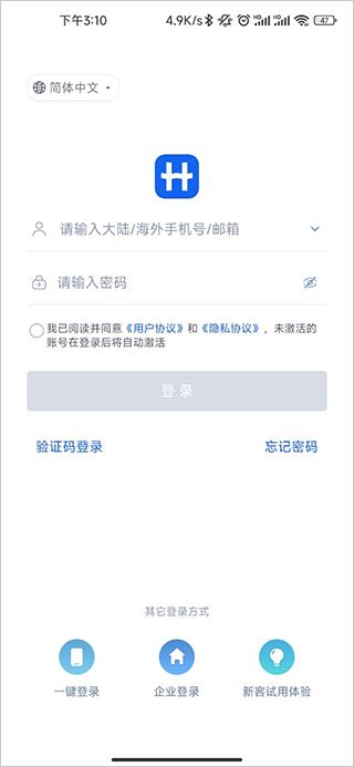 1、下载安装app,在首页找到其他登录方式,点击企业登录,输入EF邮箱&邮箱密码登录app。