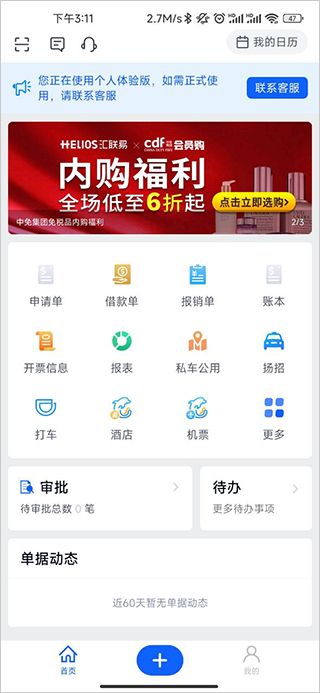 2、进入汇联易首页,点击屏幕下方+号按钮,新建报销单。