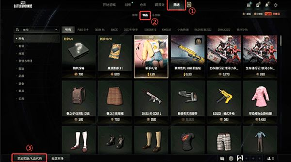 第一步:依次点击"商店"“物品""添加奖励/礼物代码"按钮