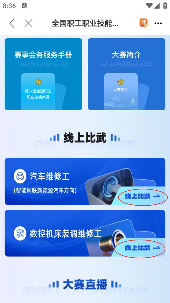 5、在下方可以选择自己比赛的方向,比如参加"汽车维修工",点击该模块的"线上比武"。