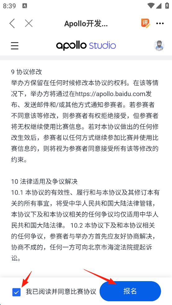 8、随后看完比赛协议,勾选左下角的"同意协议",最后点击右下角的"报名",这样就完成了比赛的报名。