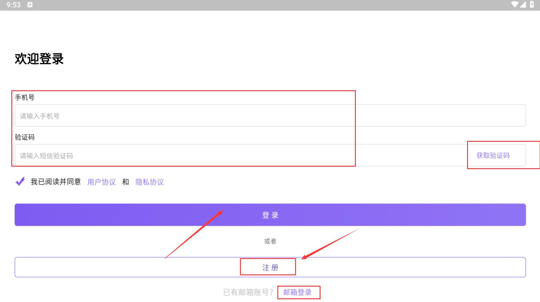 3、输入手机号和验证码即可登陆,也可以用邮箱登陆,如果没有账号点击注册
