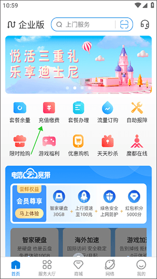 用户可以在软件上查看账单积分,或者办理新的套餐以及更换套餐