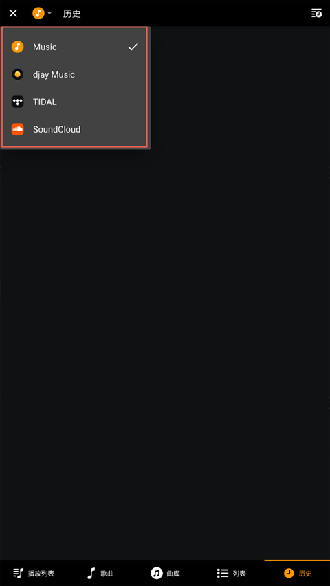 有四个选择音乐的方式分别为:Music、Djay Music、TIDAL、SoundCloud。