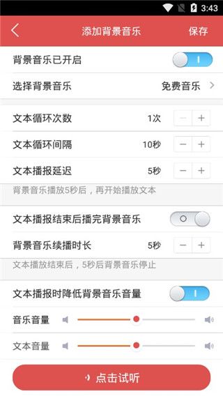 6、音量调节,背景音乐音量、文字音量任由您进行他、修改。