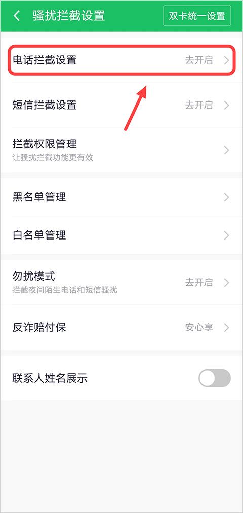 2、选择"欺诈拦截"——"电话拦截设置",点击右侧开关即可。