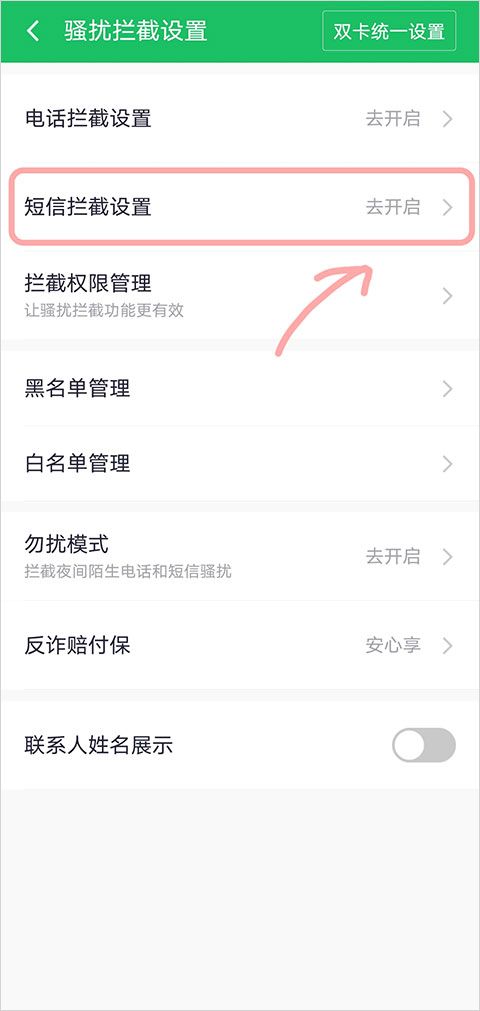 2、开启"短信拦截"右侧的开关的拦截骚扰短信。