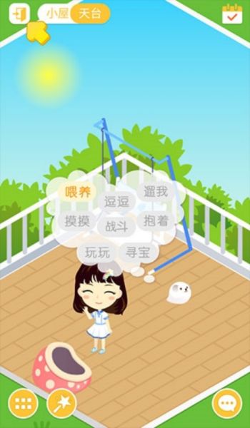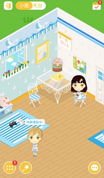 2.小屋。主界面的小屋不仅是我们甜蜜的家,里面几乎所有的家具都可以使用,还可以随心装扮!