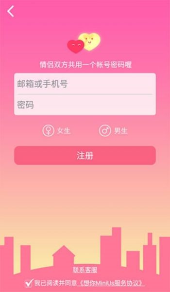 2、输入手机号和要设定的密码,选择性别,点击"注册"即可。(情侣双方共用一个帐号密码喔)