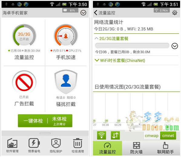 海卓手机管家是针对android平台而开发的一款给力的手机管理软件,小巧、绿色,无广告,无功能限制,能够帮助用户全方位管理手机安全,加速手机运行速度,拦截各种手机垃圾广告,还用户一个纯净的手机环境。该海卓手机管家界面简洁美观,拥有流量管理、手机加速、广告拦截、智能情景省电、骚扰拦截、软件管理、垃圾清理等功能模块,能够轻松的对手机进行管理,是继360手机安全卫士,qq手机管家又一款非常不错的手机管理软件。
