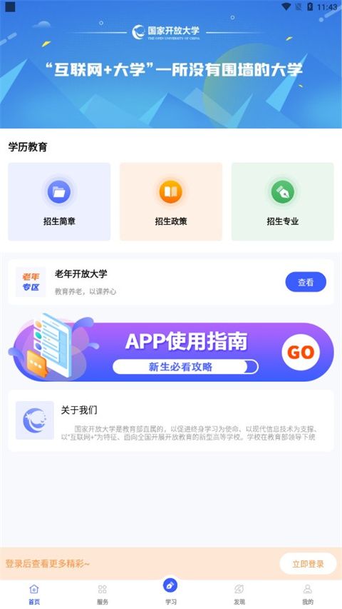 i国开手机app是国家开放大学官方移动的办公系统,该软件以促进终身学习为使命,为现代信息技术为支撑,以"互联网+"为特征,面向全国开展开放教育的新型高等学校,面向全民提供终身教育以及服务,促进"人人皆学、处处能学、时时可学"。用户登录i国开手机app以后在首页就可以看到自己申请的课程以及平台给你推荐的课程,最新的教育咨询也可以在首页进行查询。在学习板块则可以看到自己目前正在学习的课程和累积学习的次数,实时记录你的学习成长。希望大家能够在这里找到更好的自己。