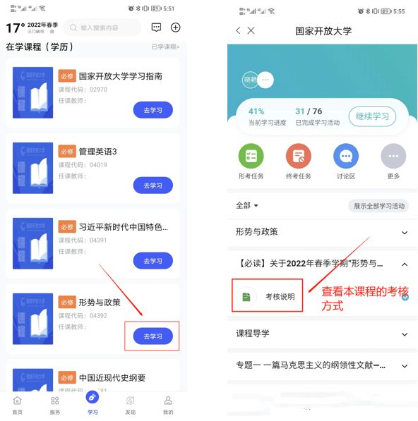 1、进入软件之后点击中间的学习栏,找到自己要完成的课程,点击去学习,然后就可以查看考核方式。