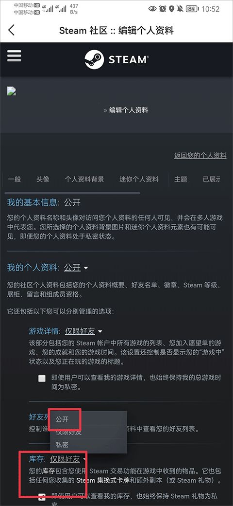 2、然后在steam账号详情界面中找到个人资料公开,并点击进入。