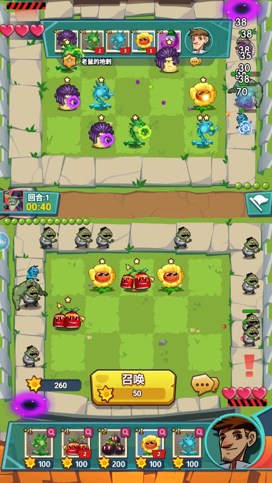 在对战的时候我们需要不断地召唤和合成植物才能提升植物属性,同时还需要消耗相应的阳光来提升攻击力