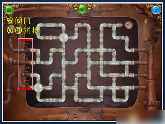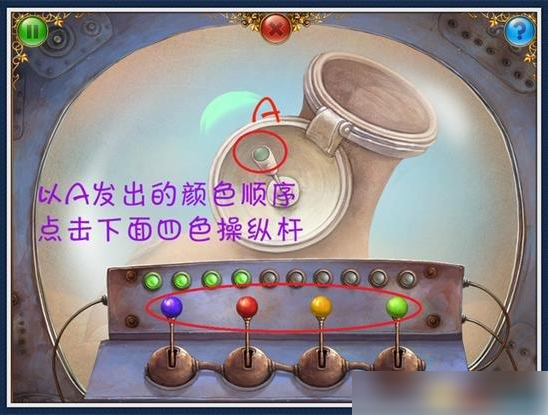 10、上来左行一步,找到6个小球。放入阀门开始谜题(图12)点击上方灯闪处。找到1个操纵杆