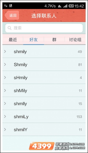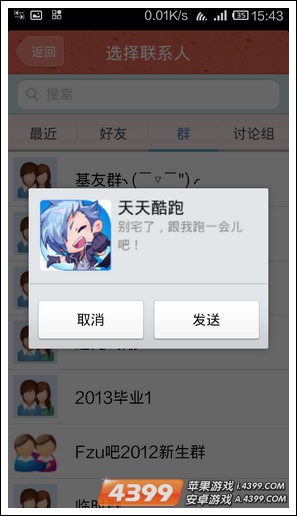 2.点击界面下部“邀请好友”按钮,游戏会自动切换到QQ读取好友列表、群组列表和讨论组列表。