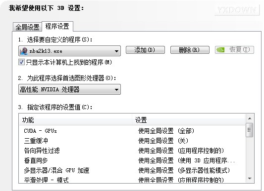 或者进入“程序设置”,添加2k13的主程序,设置为“高性能NVIDIA处理器”