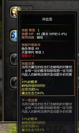 一定概率转移周围一定范围内敌人的触电效果并造成额外的伤害。我就直接举个通俗的例子吧。不知道玩家们有没有那种感觉。你对着BOSS一个连锁拍下去,然后你技能都放完了。但是BOSS的血还在少。这个时候就是触发了冲击流。因为这个时候比较明显。其实只要是让对方感电或者怎么样就会造成冲击流效果,只不过有时候效果不太明显罢了。论坛也有很多冲击流的测试图,我就不一一说明了。我只想告诉玩家们这个是神技就可以了。