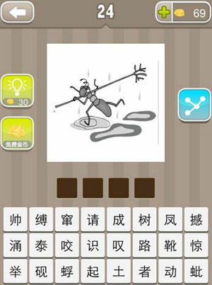 2025-12-03 16:34 来源:西西软件下载 作者:佚名《疯狂猜成语》中有一只蚂蚁扛着一根树枝的图片,脚下踩着几个水滩,蚂蚁玩家们可以联想到蚍蜉,只要想到蚍蜉就很好猜了,图片如下所示: