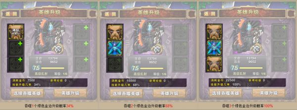 单张绿金卡牌的技能升级概率是34%;两张68%;三张100%