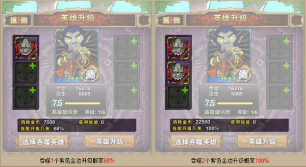 单张紫金卡牌的技能升级概率是68%;两张100%