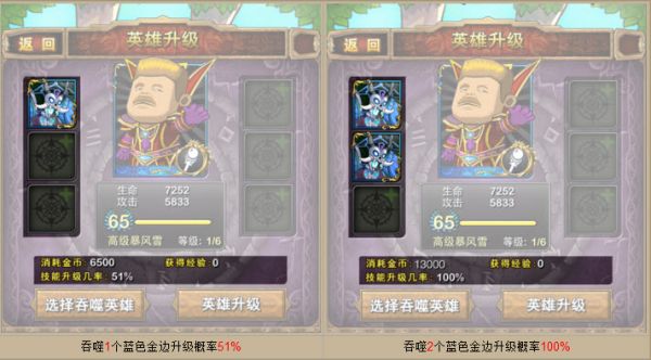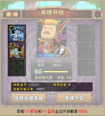卡牌技能如何升级:如一个法师(方砖)带有主动技能暴风雪,则英雄升级时,选择吞噬英雄中带有暴风雪技能的卡片时,每张灰卡有10%升级到相关技能。(特别提醒:绿卡20%,蓝卡30% ,紫卡40%升级到相关技能)