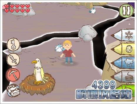 2、第二块拼图和毛球在第一关终点的位置,到达第一关终点的时候先别获得碎片,先使用锄头将边上的石头打开,然后在上面的鸟巢画上蛋,踩在羽毛上鸟就会带着上去高台即可获得第二块拼图。