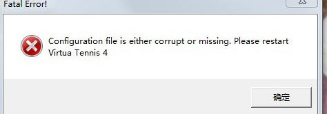 2025-12-31 10:37 来源:西西软件下载 作者:佚名第一次启动《虚拟网球4》,弹出“fatal error:configuration file is either corrupt or missing. please restart virtua tennis 4 ”错误,如下图所示: