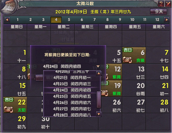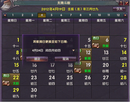 黄道吉日可以使用100元宝进行修改,点击相应吉日的下的“运”按钮。