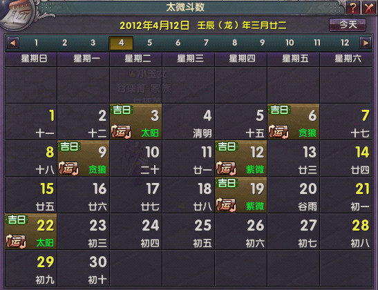 每月中随机6天(不一定相连)为黄道吉日,吉日共有3种,每种吉日有不同的效果。