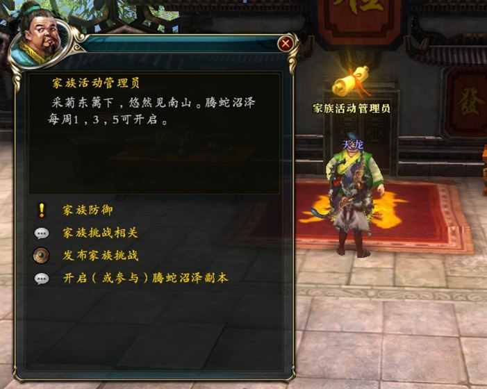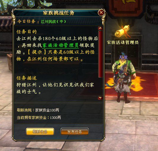 1、 每个家族的族长,或者副族长,每天可以在大部分家族成员在线的时候,在家族地图的家族活动管理员(279,242)处发布家族跨国挑战任务。