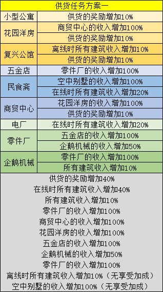 供货任务方案:小型公寓,花园洋房,公馆,五金店,民食斋,商贸中心,电厂,零件厂和企鹅机械。