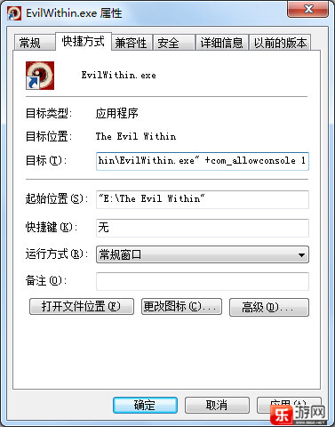 2.在快捷方式的属性-目标最后加上 +com_allowconsole 1(不确定要不要+号)