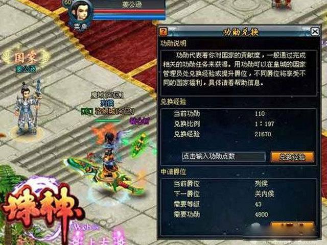 封侯在游戏里不仅仅是简单的身份象征,更可以得到大量的经验,节省修理装备的费用。例如当身份达到大上时,用户每天可以得到30000经验值,爵位越高,所获得的经验也就越多。总之,在7711《诛神》里,同样有三六九等,同样是靠实力夺天下。用户需要付出时间去提高自身的能力,从而获得权力的巅峰。