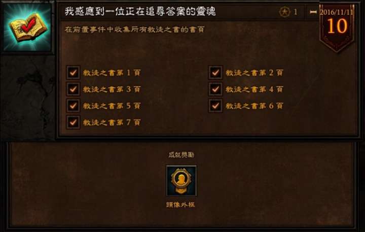 活动期间,在部分场景会出现一小群穿黑衣服的教徒,击杀后会随机掉落一张所需书页,集齐全部7种即可获得该成就。该成就奖励一个天使头像框