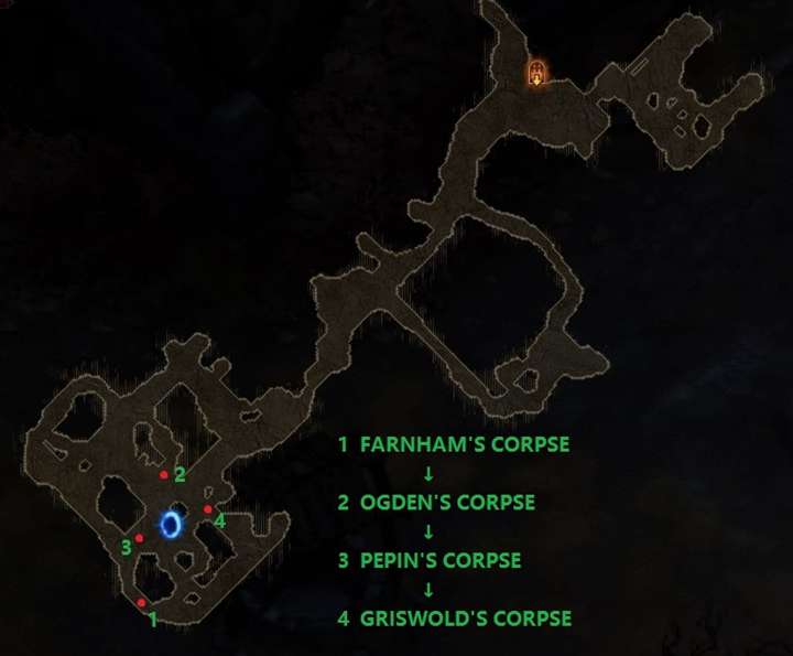 3、回到崔斯特姆,按照下图标注的顺序点击四具尸体,并拾起掉落的道具,最终将获得设计图:维特的腿。