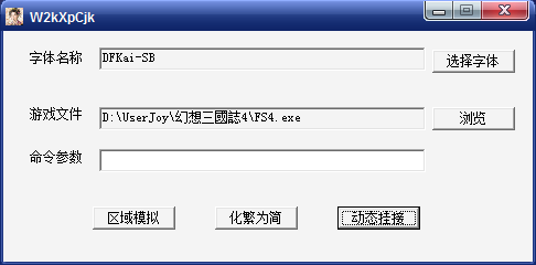 因为<幻想三国志4>此次使用了Sony的Securom防拷系统,故此次本游戏无法使用微软的APP挂载进行化繁为简操作.可能由于执行程序思路的变化,本次游戏在进入后进行化繁为简挂接可能无效或者报错.之前转区是唯一可以能够解决游戏乱码并较好显示的方案,研究后发现W2kXpCJK现在也可以在不转区的方式下完美显示.
