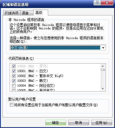 转区方式说明: 打开控制面板,选择"日期,时间,语言和区域设置"选项.选择"区域和语言选项",点选"高级",后选择非unicode程序替换为中文(台湾),点确定保存后重新启动即可.