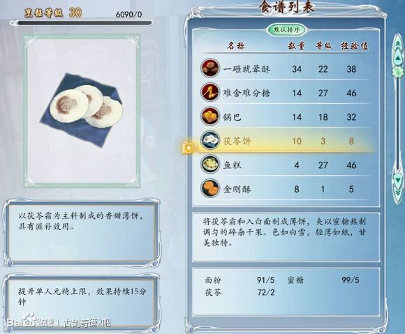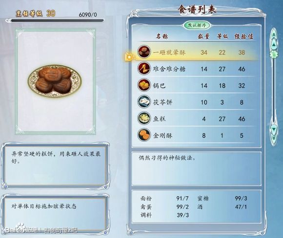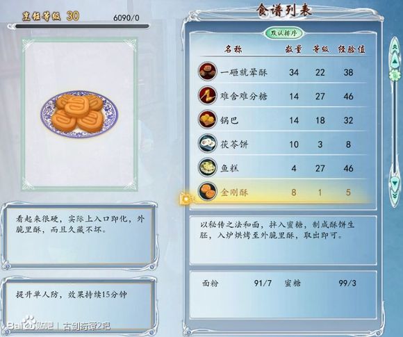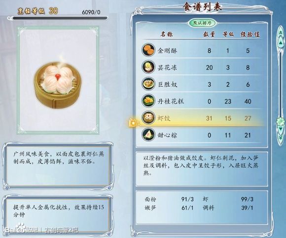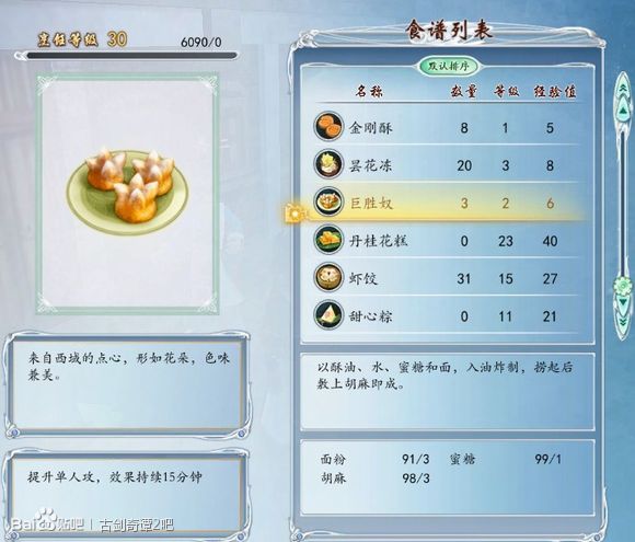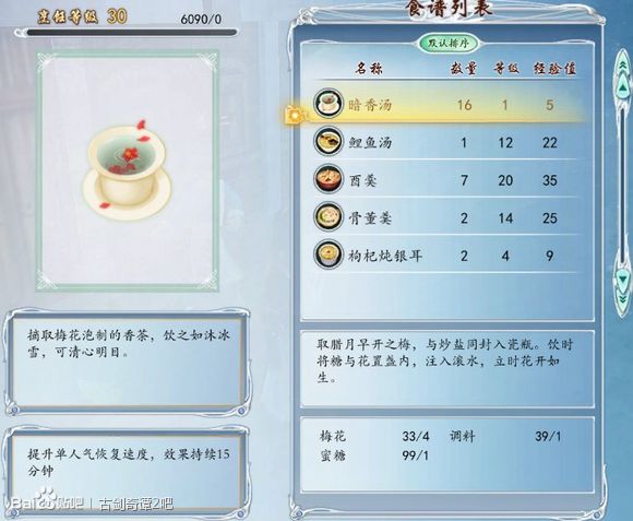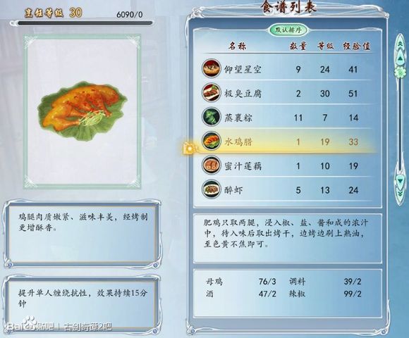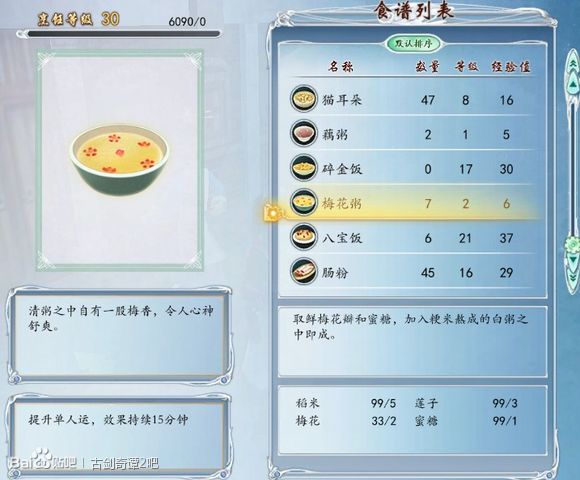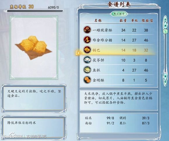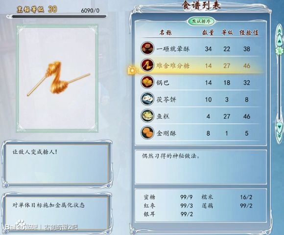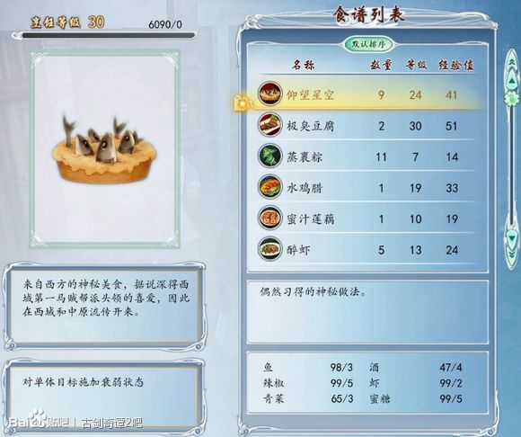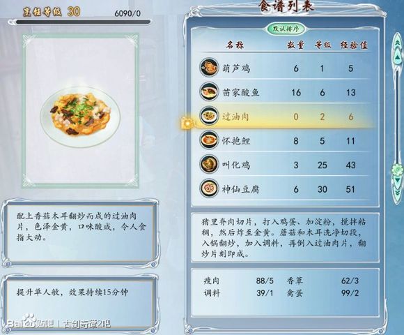 古剑二系统有烹饪等级设定,等级不够不能做出相应等级的菜品,最高等级是30级,而且也要30级才能烹饪出所有食品。