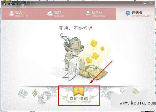首先你需要注意的是:只有QQ2012 Beta2试用版才可以看到巧遇卡哦,旧版QQ可能没有此功能的。所以你要先去免费申请优先体验更新QQ后再来吧。www.keaiq.com