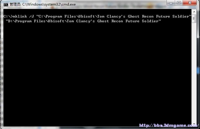 在CMD命令窗口中输入:mklink /J "C:\Program Files\Ubisoft\Tom Clancy's Ghost Recon Future Soldier" "D:\Program Files\Ubisoft\Tom Clancy's Ghost Recon Future Soldier"