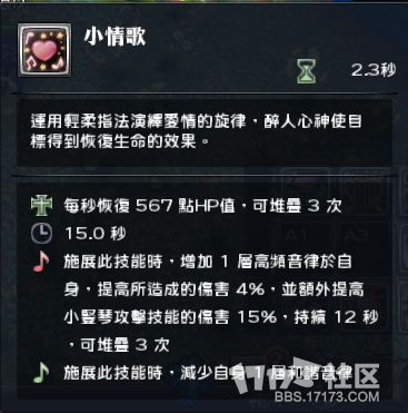 神技·小情歌 因为可以不停的加所以持续回血速度还是可以的,并且你每放一次小情歌就有高音旋律(增加4%造伤可叠加三次)