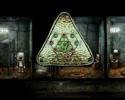 这样的目的就是为了不要去把怪物漏掉之类的,当然在我们完成这个小的游戏了之后,我们是可以得到一个小的灯泡的,然后再需要去完成一个八角形的解谜,也就是电梯房间里面的开关,我们可以根据科学家的提示就可以完成这个开关了,然后在电梯到了之后,我们会看四个不同的场景,我们在最下面的位置,上面分别是有三个不同的场景的,我们来到了这里了之后,就是需要去把警卫机器人的房间,去使用水管去灌满水,然后我们在去使用得到的锤子去砸那个锁,就可以使得这些警卫掉到下水沟里面去了,我们这关就通关了,下一个关卡也是大结局关卡了。