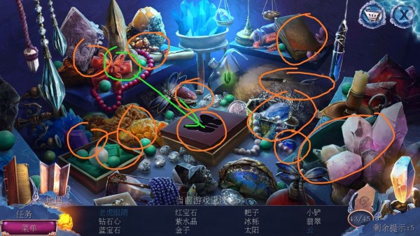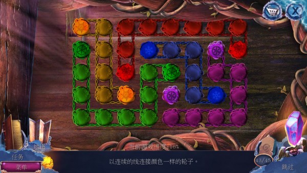 去果园,从门上拿到凿子,在鸟窝里得到烧烤夹子(两块拼成一块),回小屋,在水龙头下方用凿子得到注油器,开果园的门,得到挂锁,点开书后篮子,得到坚果钳。用烧烤夹子夹起曲柄,安上,把铁链弄到神兽旁边,用挂锁连接铁链和木板的环,把木板拖开,得到茶巾。