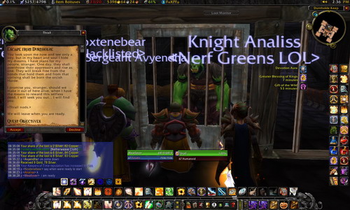 在时光的伪装下,我的暗夜精灵队友们都成了符合那个时代的人类装扮,但这并没有降低敦霍尔德守卫们的戒心。“如果没有盖有普劳德摩尔印鉴的通信证,谁也别想通过。”左边的门卫对我们说道,而右边的门卫则警戒的端起了手中的火枪。那么只有硬闯了。(66级的精英对于67级的5人队伍来说并不是什么难题。)轻松放到了看守,我们大摇大摆的进入了敦霍尔德城堡。低地处几间木制的简陋平房便是集中营了,显得与巨石堆砌的堡垒格格不入,里面关押着数十个衣着简陋的兽人。并没有重兵把守,只有几个sentry和warden守在门前,另外有数个rifleman带着猎犬四处巡逻。(门口的2个守卫与门内的守卫仇恨link,所以一次pull,就会引来4个精英,处理不好可能会导致灭团。尽可能控制其中的1个到2个,然后集中力量解决即可。)将守护者交给我们的定时燃烧装置分别安置在5个木房内,随着巨响,集中营一瞬间成为了火海。兽人奴隶们为到来的自由纷纷振臂高呼,吼声响彻天际。爆炸声引来了驻守的中尉德雷克(LieutenaentDrake),他高声怒斥着,指挥着剩余的守卫们将火扑灭。他回转身来,发现了我们,明白了一切:“我知道你们是来这里干什么的,不过你们将终结于此,永久的。”第一场boss战就此开始。(68级的精英,除了比较高伤害的顺劈以外,没有任何特别技能。可以很轻易的战胜。)遇到了我们,他可怜的命运也在此终结了。料理了他之后,我们向关押萨尔的地牢迈进,勉力抵抗的门卫没有给我们带来多大麻烦----我们在底层的地牢见到了我们的王子,未来的兽人领袖,萨尔。(第1阶段任务完成)