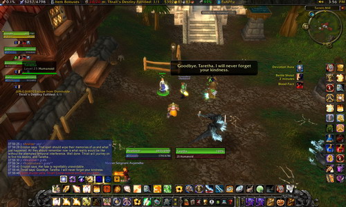 跟随着勇猛的兽人英雄,我们成功地突出重围,杀到了敦霍尔德堡垒的正门。不停的拼杀消耗了我们不少的体力,正准备借此喘息调整,巡逻归来的队长斯卡洛克(CaptainSkarloc)出现在了我们面前。他和两个随从见到萨尔后脸色大变,跳下马来。他用讥讽的口吻说道:“萨尔,你以为你能从敦霍尔德逃走么。你和你的喽罗们都将葬身于此。”没有什么好说的,一个字,战!(68级的精英boss以及2个67级的精英,萨尔能够独力对付其中的1人,将另1个随从控制住,然后集中将boss杀死。)“大言不惭!”萨尔看都不看到在地上的骑士一眼,骑上这可悲的失败者留下的坐骑,与我们一起奔向塔轮米尔,也就是塔蕾莎(Taretha)的所在地。