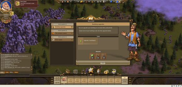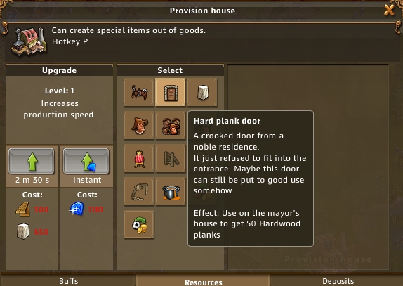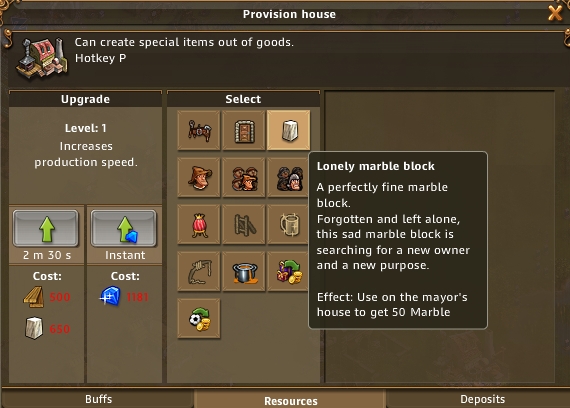 我们可以升级建筑来增加他们的生产力。注意建筑升级不仅要耗费建筑材料,升级之后还会消耗更多的物资来增加生产。建议从产业链的原料开始升级。这次我建议玩家们升级一个铜矿,把奖励的大理石与硬木板留下来。以后你就知道作用了。