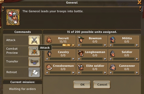 营地出来之后。左击营地。你就可以为他分配部队。暂时最多只能带200人,我们把手上的部队都给他。