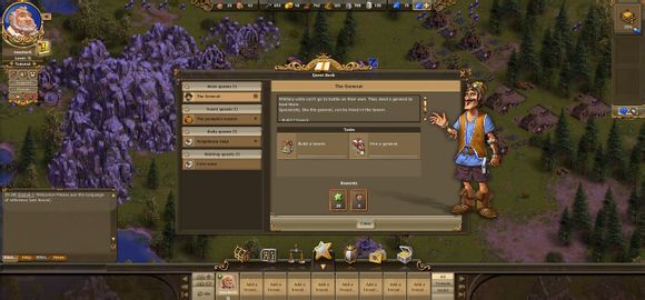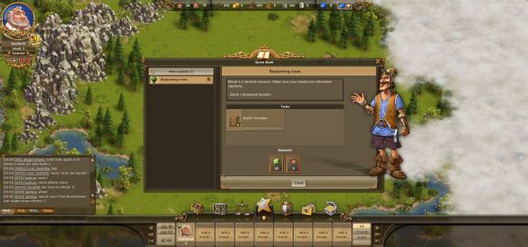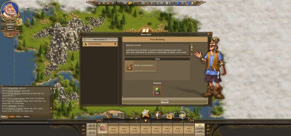 左键点击头像边的黄色小叹号,打开任务栏。任务一般分三种,我们先接触的是主线任务(Main quests),必须完成的。我们的第一个任务是建造一个伐木场,奖励(Reword)会是100经验。